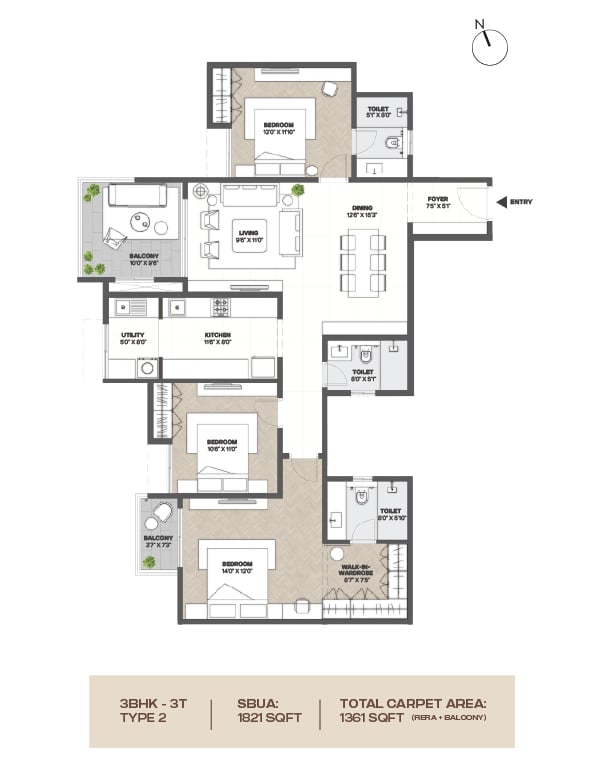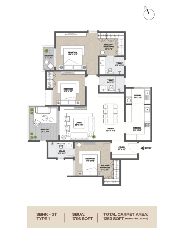 Vitrified flooring in the Foyer, Living, Dining, Corridors, and all Bedrooms.