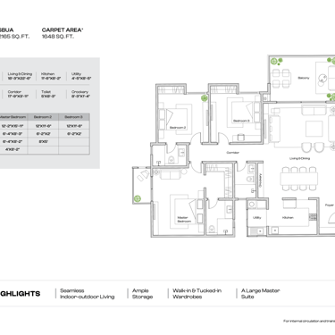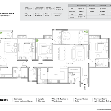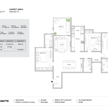 Vitrified flooring in the Foyer, Living, Dining, Corridors, and all Bedrooms.
