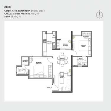 Vitrified flooring in the Foyer, Living, Dining, Corridors, and all Bedrooms.